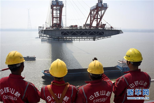 3月13日,在安徽池州長江公路大橋建設現場,施工人員在關注鋼箱梁吊裝進度。新華社發(fā)(過仕寧 攝)