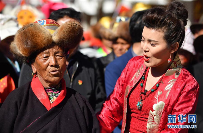 克松社區(qū)村民央金(左)和歌手合唱《我和我的祖國》(3月20日攝)。 新華社記者 覺果 攝