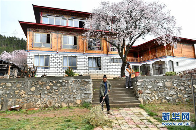 4月2日,波密縣古鄉(xiāng)嘎朗村的德青旺姆(右)和弟弟多頓扎巴在打理自家民宿。  新華社記者 李鑫 攝
