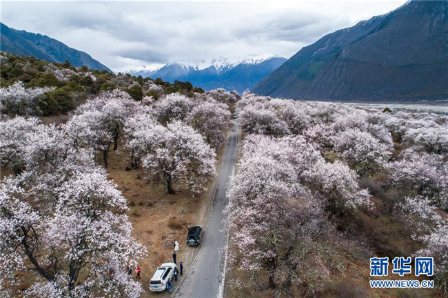 4月2日,游客在波密縣桃花溝游玩(無人機(jī)拍攝)。  新華社記者 李鑫 攝