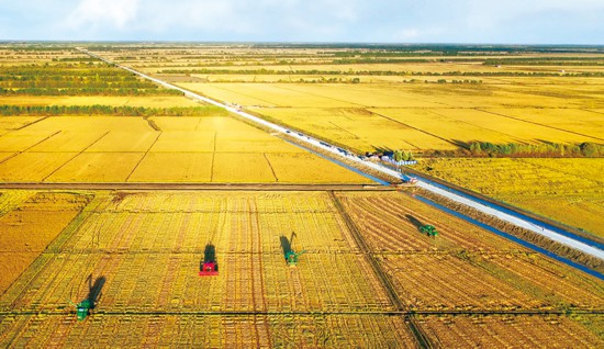 中國人要把飯碗端在自己手里,而且要裝自己的糧食。改革開放40多年來,我國農(nóng)業(yè)農(nóng)村現(xiàn)代化建設(shè)取得重要進(jìn)展,農(nóng)業(yè)物質(zhì)技術(shù)裝備水平不斷提高,確保糧食安全的基礎(chǔ)更加牢固。黑龍江是我國糧食生產(chǎn)大省,2018年糧食產(chǎn)量超過1500億斤,實現(xiàn)“十五連豐”。圖為無人機(jī)航拍的大型農(nóng)機(jī)在黑龍江省三江平原一處稻田收割水稻。 新華社記者 王建威/攝