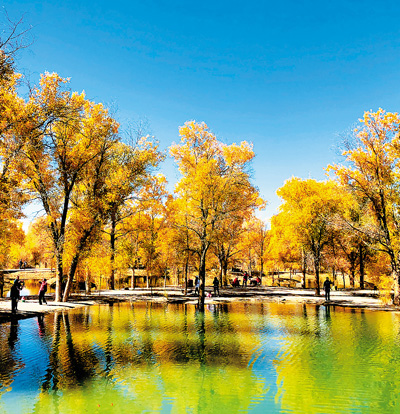 甘肅金塔胡楊林是三北防護(hù)林體系的一部分。圖為2018年10月9日,游人在金塔森林公園觀賞胡楊林美景。王 春攝(人民視覺)