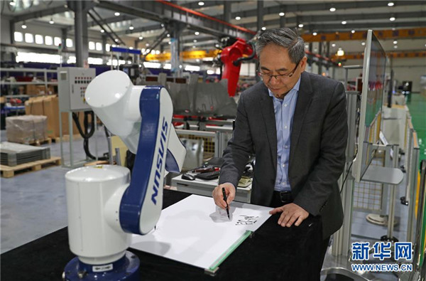 3月29日,沈陽新松機(jī)器人自動(dòng)化股份有限公司創(chuàng)始人兼總裁曲道奎和公司生產(chǎn)的機(jī)器人共同書寫“愛國奮斗”字樣。 新華社記者 楊青 攝