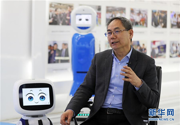3月29日,沈陽新松機(jī)器人自動(dòng)化股份有限公司創(chuàng)始人兼總裁曲道奎和公司生產(chǎn)的機(jī)器人互動(dòng)。 新華社記者 楊青 攝