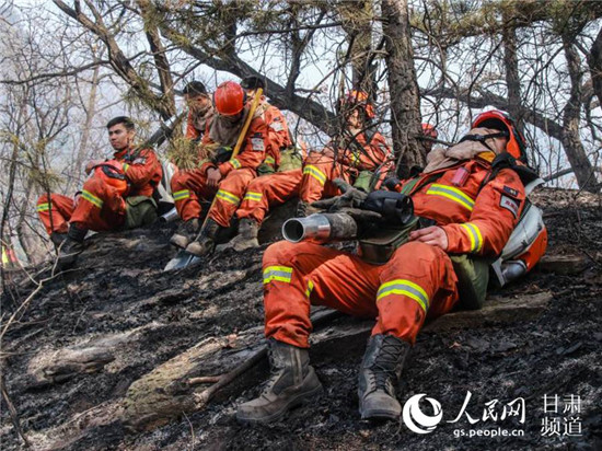 火場火勢緩解后,消防員原地休息。(甘肅省森林消防總隊(duì)供圖)