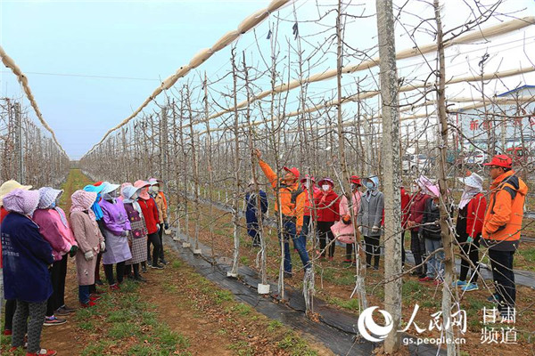 4月4日,寧縣焦村海升模式現(xiàn)代農(nóng)業(yè)高科技示范園技術(shù)人員正在培訓(xùn)春季果園管理技術(shù)。(李綱陵 攝)