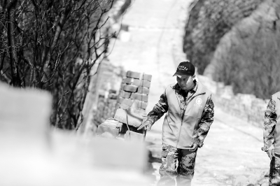 上午10時,記者跟隨參與長城修繕的工作人員向箭扣長城進發(fā)。經(jīng)過近1個小時的攀登,記者們都已經(jīng)疲憊不堪,工作人員卻依然步履輕松,“我們每天都要上下爬一趟,已經(jīng)習慣了。”一位工作人員說。終于抵達151敵樓,蜿蜒于山脊線上的箭扣長城展現(xiàn)出了它的雄姿。在151的南側(cè),工人師傅正在對一段城墻進行修繕,他們搬起一塊塊幾十斤重的舊城磚,小心翼翼地把它鋪到城墻面上,再用橡膠錘敲打緊實。