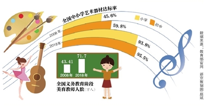 根據(jù)教育部公布的最新數(shù)據(jù),2018年全國小學(xué)藝術(shù)器材達(dá)標(biāo)率提高到93.8%,初中提高到95.5%;2018年全國義務(wù)教育階段美育教師人數(shù)增加到71.7萬人。比10年前有較大幅度提高。