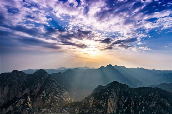 華山最高的山峰,有海拔2154.9米,站在南峰頂,一覽眾山小,遠(yuǎn)處就是連綿不斷的秦嶺山脈。