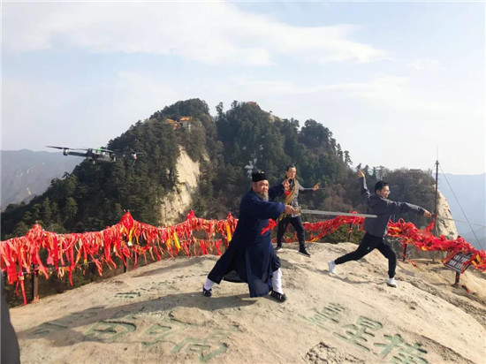 《百家講壇》魏新學(xué)者、《奇葩說(shuō)第五季》清華名嘴楊奇函及中國(guó)道教協(xié)會(huì)車道長(zhǎng)在西峰頂拍攝《華山論劍》文化旅游紀(jì)念片