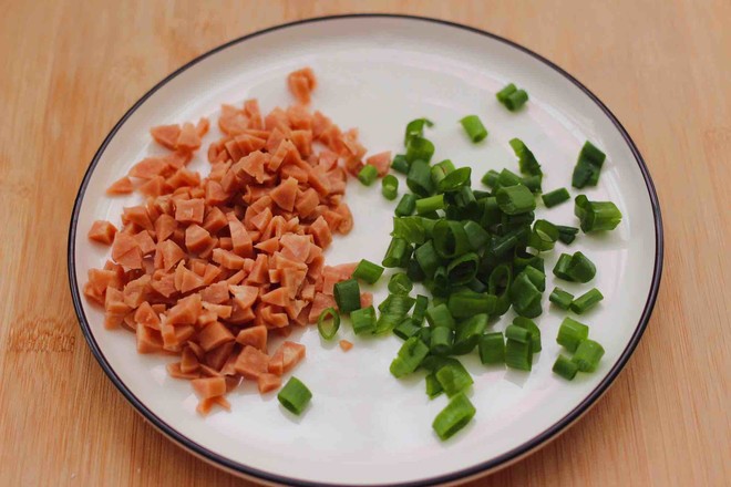 1.準(zhǔn)備好小香蔥,把小香蔥用刀切碎,最好只用蔥綠部分,顏值高喲,把火腿腸去皮后用刀切成小碎丁。