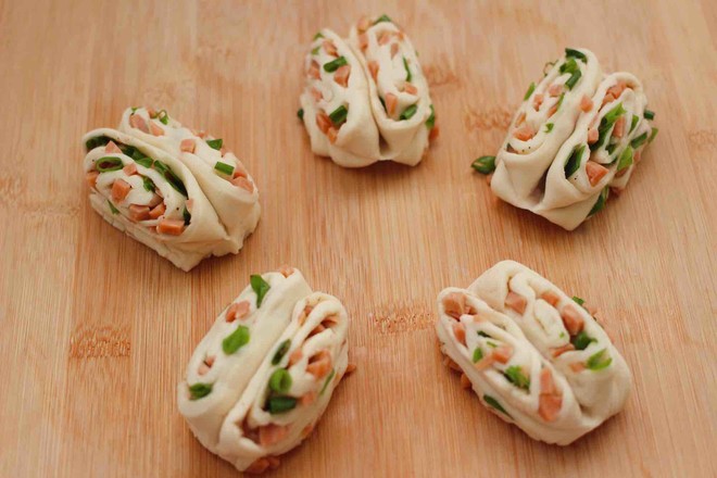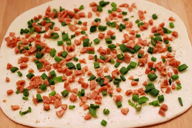 主料:中筋面粉200克 小香蔥3顆 火腿腸1根 酵母2.5克 鹽1克 花椒粉2克 花生油5克