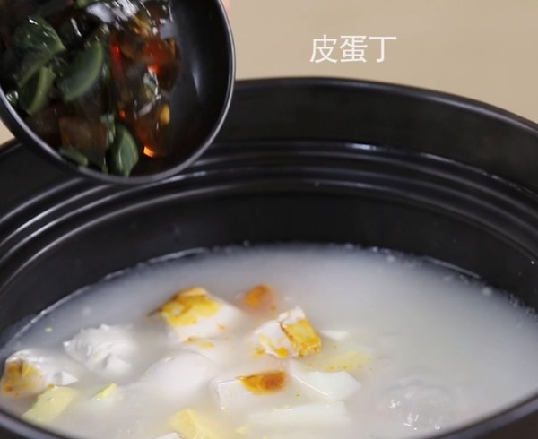 5.加入雞蛋、咸鴨蛋、皮蛋丁繼續(xù)熬煮10分鐘。