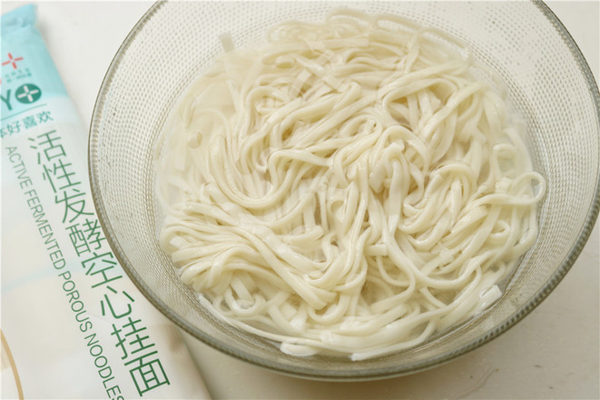 1.準(zhǔn)備好食材。金龍魚新品活性發(fā)酵空心掛面,做拌面口感也超好。