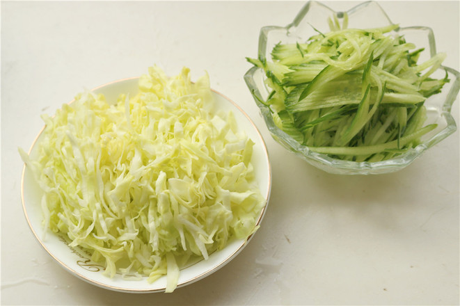 2.把配菜處理一下,黃瓜切成細(xì)絲,如果刀工不好,可以借助于擦絲器,圓白菜去掉中間的莖,切成細(xì)絲。圓白菜絲用開(kāi)水燙一下,再過(guò)一下涼水待用。