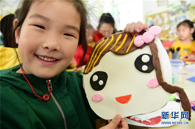 5月7日,在江蘇省鎮(zhèn)江市解放路幼兒園,一名小朋友展示自制的笑臉卡。新華社發(fā)(石玉成 攝)
