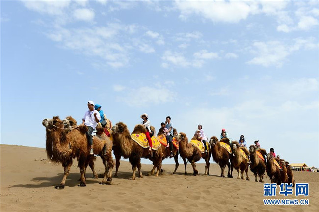 游客在新疆鄯善縣庫木塔格沙漠公園騎駱駝?dòng)斡[(5月2日攝)。 新華社發(fā)(丁磊攝)