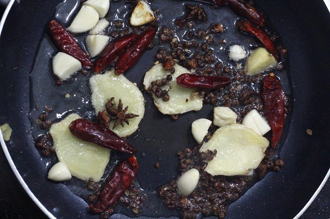 4.再放入花椒、干辣椒、小米椒大火爆炒出紅油。