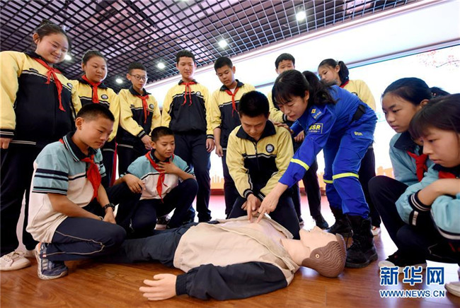 5月12日,邢臺市第八中學學生在藍天救援隊隊員的指導下學習心肺復蘇急救技能。 新華社記者 朱旭東 攝