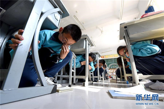 5月12日,邢臺市第八中學學生在進行模擬防震減災演練。新華社記者 朱旭東 攝