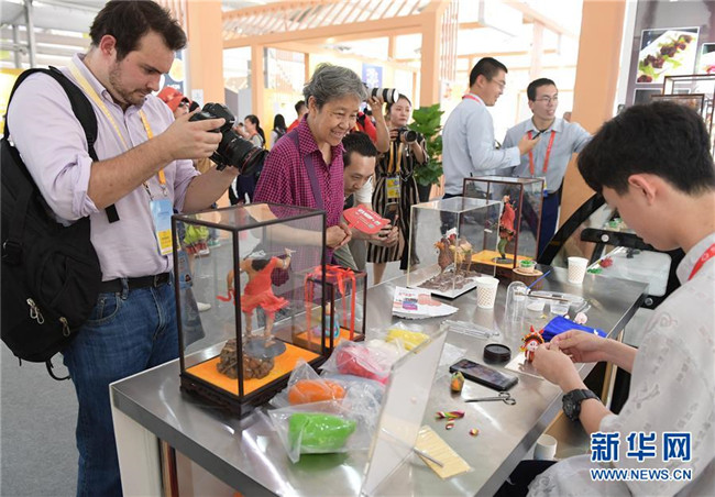 5月16日,在北京奧林匹克公園,參觀者觀看面塑技藝展示。 新華社記者 李賀 攝