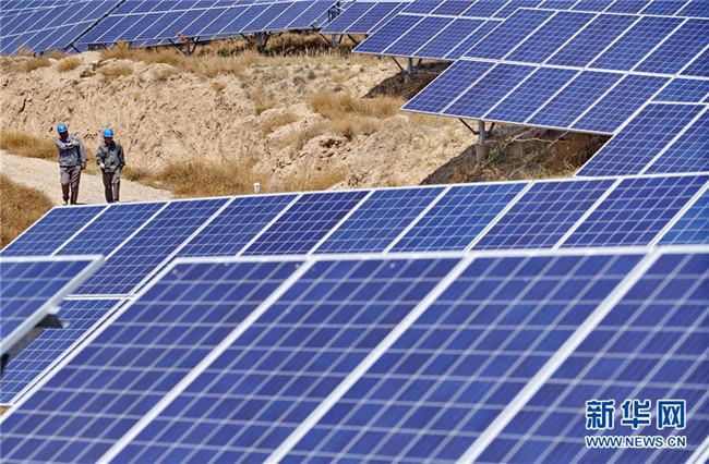 工人在河北省張家口市懷安縣西沙城鄉(xiāng)西沙城村附近荒山上的光伏發(fā)電場巡查并網(wǎng)線路(5月13日攝)。新華社記者 楊世堯 攝