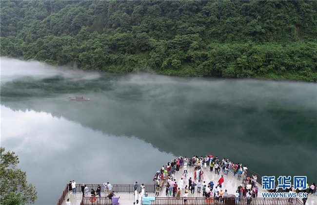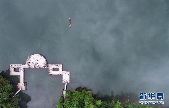 5月25日清晨,一艘小船劃過(guò)小東江江面,吸引游人駐足(無(wú)人機(jī)拍攝)。新華社發(fā)(朱孝榮 攝)