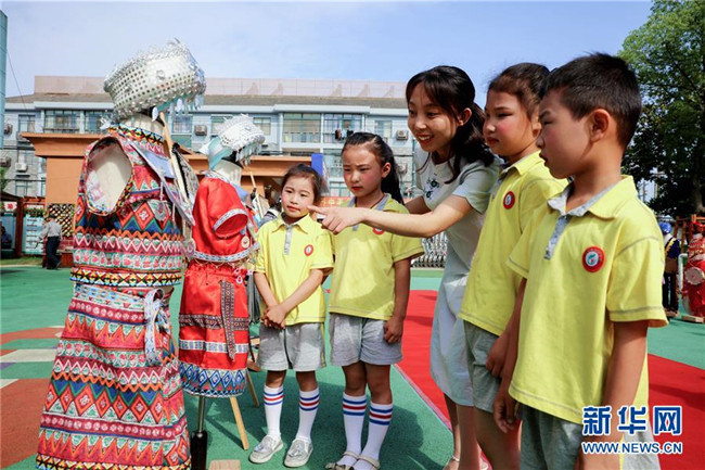 5月28日,老師帶領(lǐng)孩子們認(rèn)識(shí)不同民族的服飾。