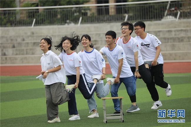 6月1日,湖南省永州市道縣一中高三學生參加單腿跳游戲。新華社發(fā)(王滋創(chuàng) 攝)