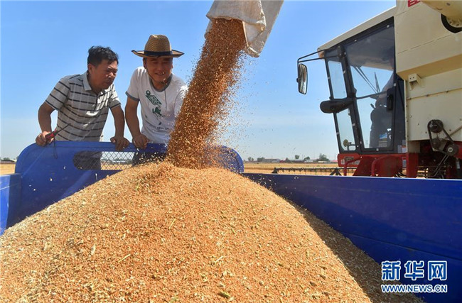 6月10日,在河北石家莊市藁城區(qū),小麥種植戶劉和賓(右)查看剛剛收獲的小麥。 新華社發(fā)(張曉峰 攝)