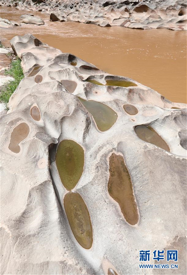這是6月16日拍攝的四川省會(huì)東縣鲹魚河鐵柳鎮(zhèn)火石村段的壺穴地貌。