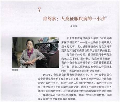 據(jù)悉,今年秋季學期將開始推廣的統(tǒng)編高中語文教材已確定將屠呦呦2011年的獲獎感言及同年發(fā)表的論文改編成課文《青蒿素:人類征服疾病的一小步》。人民教育出版社有關負責人介紹,屠呦呦在青年時期培養(yǎng)了對傳統(tǒng)醫(yī)藥學的熱愛,歷經(jīng)數(shù)年終于從古代藥典中獲得靈感,發(fā)現(xiàn)了青蒿素,并且至今仍在科學探索道路上孜孜以求。此次選錄這篇文章,旨在引導學生了解和尊重科學,從屠呦呦的科研歷程中汲取力量。