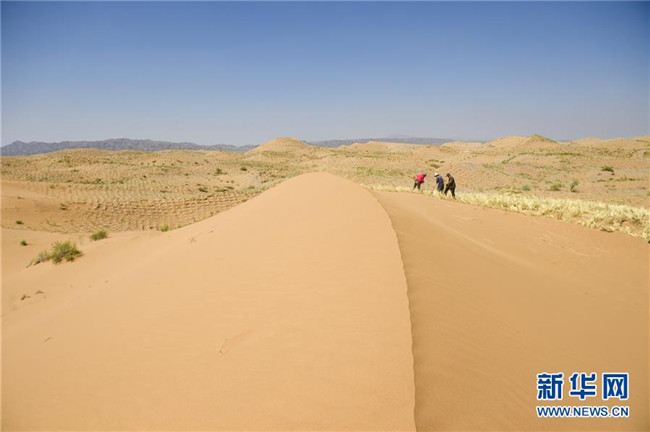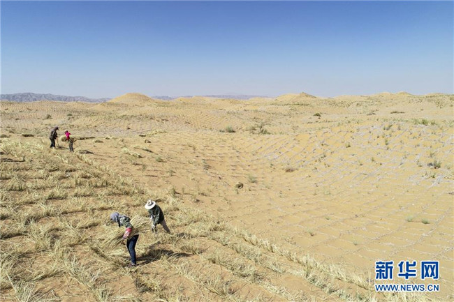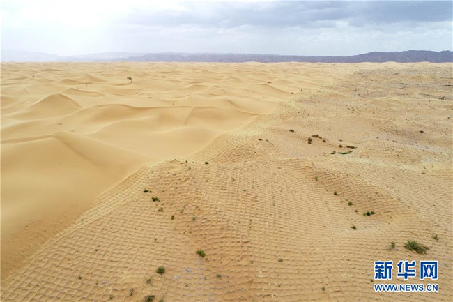 寧夏中衛(wèi)市位于騰格里沙漠南緣,在長(zhǎng)期抵抗沙漠化侵襲的實(shí)踐和探索中,一套“先固后治,固阻結(jié)合”的防沙治沙新模式在這里應(yīng)用。人們利用草方格固沙,在扎好的草方格中播撒草種,形成植物沙障。據(jù)了解,截至2018年底中衛(wèi)市已完成沙區(qū)治理147萬(wàn)畝。新華社記者馮開(kāi)華攝