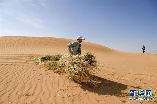 在寧夏中衛(wèi)市長(zhǎng)流水沙區(qū),治沙工人在沙漠中搬運(yùn)麥草(6月13日攝)。新華社記者馮開(kāi)華攝