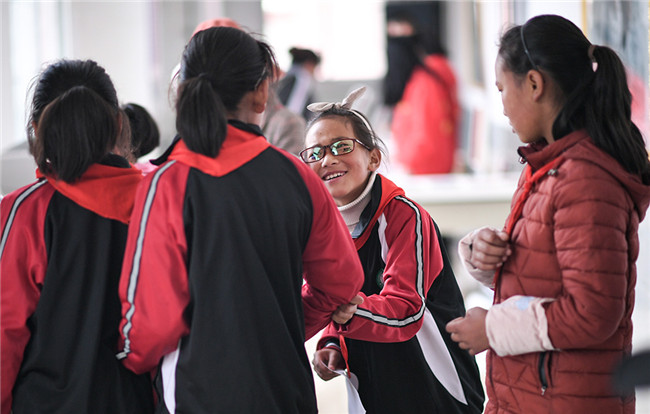 6月17日,在若爾蓋縣中學(xué),配完眼鏡的扎西旺姆與同學(xué)們聊天。