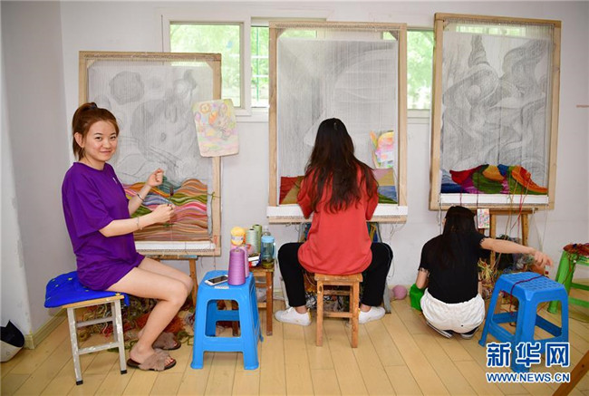 西安美術(shù)學(xué)院特殊教育藝術(shù)學(xué)院工藝美術(shù)專業(yè)學(xué)生在進(jìn)行纖維藝術(shù)創(chuàng)作(5月23日攝)。新華社記者邵瑞攝