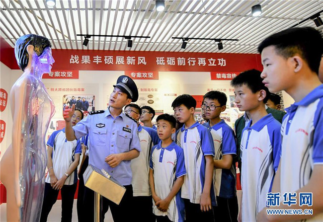 6月26日,在山東省棗莊市臺兒莊古城中學的禁毒教育基地,民警向學生介紹新型毒品的種類、特征和危害。新華社發(fā)(高啟民攝)