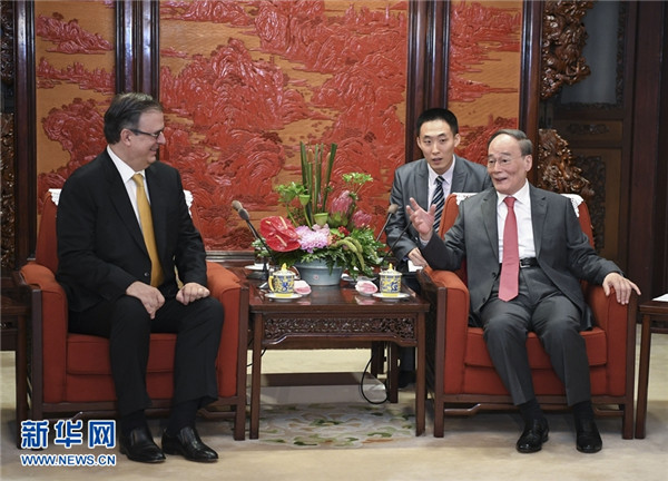 7月1日,國家副主席王岐山在北京中南海會(huì)見墨西哥外長(zhǎng)埃布拉德。新華社記者殷博古攝
