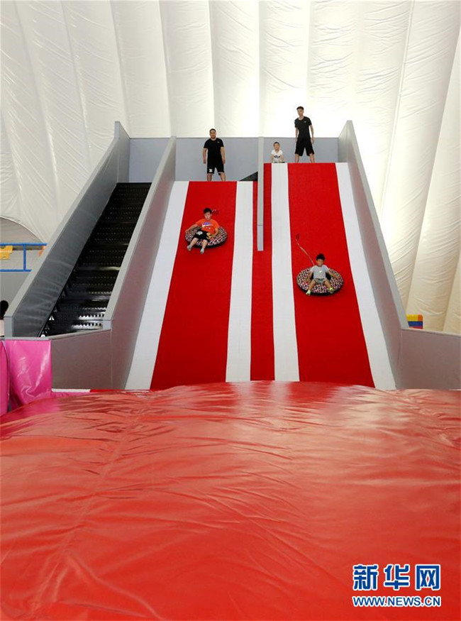 7月1日,市民在山東省棗莊市“冰雪城堡”內(nèi)玩耍。新華社發(fā)(孫中喆 攝)