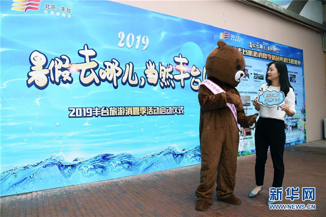 7月6日,市民在2019豐臺旅游消夏季活動(dòng)啟動(dòng)儀式上與吉祥物互動(dòng)。 新華社發(fā)(任超 攝)