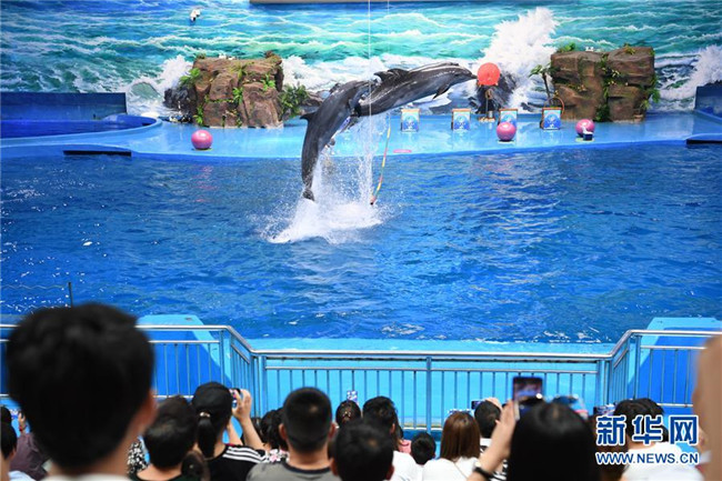 7月10日,游客在海洋世界觀看動(dòng)物表演。新華社發(fā)
