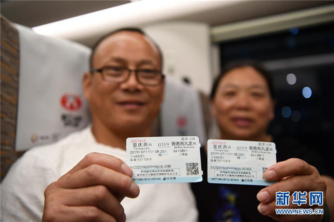 7月11日,乘坐G319次列車的乘客展示前往香港的車票。當日,重慶至香港直達高鐵正式開通,此次首發(fā)的G319次復興號列車運行速度350km/h,沿途經停遵義、貴陽東、桂林西、肇慶東、廣州南和深圳北站。列車由重慶西站至香港西九龍站全程運行需7小時37分鐘,全程票二等座票價為660元。目前內地與香港聯通的高鐵車站已增加到58個。新華社記者唐奕攝