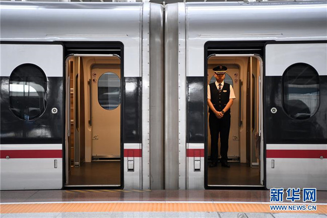 7月11日,乘務員在G319次列車上等待旅客上車。當日,重慶至香港直達高鐵正式開通,此次首發(fā)的G319次復興號列車運行速度350km/h,沿途經停遵義、貴陽東、桂林西、肇慶東、廣州南和深圳北站。列車由重慶西站至香港西九龍站全程運行需7小時37分鐘,全程票二等座票價為660元。目前內地與香港聯通的高鐵車站已增加到58個。新華社記者唐奕攝