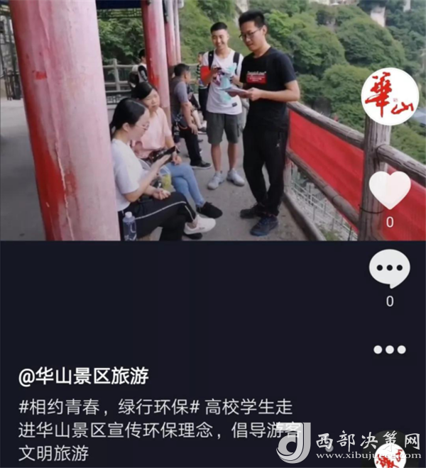 活動還通過高校網(wǎng)絡紅人拍攝抖音“青春最美,華山見證”主題短視頻等傳播方式,在網(wǎng)絡線上形成熱度,為華山綠色環(huán)保游提供了新方式。