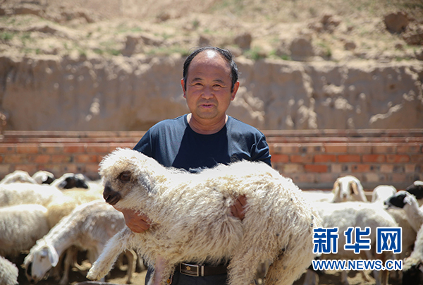 一位村民向記者展示自家養(yǎng)殖的灘羊(7月4日拍攝)。 新華網(wǎng) 肖寒 攝