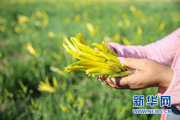 一位村民向記者展示剛剛采摘下來的黃花菜(7月4日拍攝)。 新華網(wǎng) 肖寒 攝