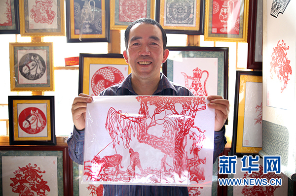 紅崖老巷子民俗村“剪紙情郎”楊國權(quán)向記者展示剪紙作品。 新華網(wǎng) 肖寒 攝