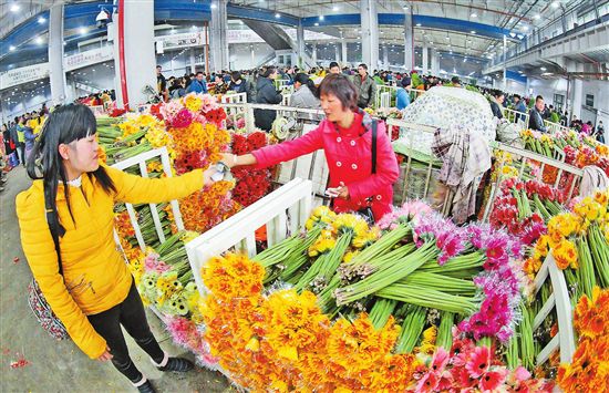 云花是云南省一張亮麗的名片。2018年,云花總產值達到525.9億元,40多萬從業(yè)者參與到這份美好的事業(yè)中,成為脫貧致富和全面建成小康社會的重要產業(yè)力量。圖為斗南花市上忙碌的賣花人。(記者黃喆春攝)