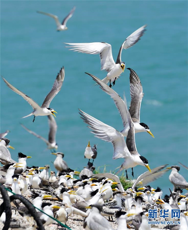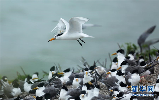 中華鳳頭燕鷗(嘴端黑色)和“近親”大鳳頭燕鷗在一起(7月24日攝)。新華社記者 殷曉圣 攝