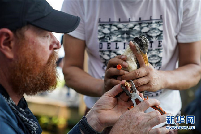 7月25日,美國鳥類保護專家在浙江韭山列島國家級自然保護區(qū)為一只鳳頭燕鷗幼鳥戴上標志。新華社記者 殷曉圣 攝